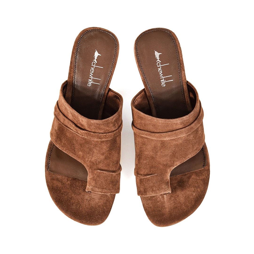 <p>Мюли из мягкой коричневой замши &mdash; спокойный акцент в летнем гардеробе. Открытый мыс с деликатной перемычкой между пальцами и широкая драпированная планка создают пластичный силуэт, который красиво повторяет форму стопы. Невысокий изящный каблук даёт аккуратный подъём и остаётся комфортным в течение всего дня. Модель легко поддерживает разные сценарии: её можно надеть с льняными брюками и топом, струящимся платьем до середины икры или прямыми джинсами. Тёплый коричневый оттенок мягко сочетается с бежевой, молочной и пастельной палитрой и работает как нейтральная база с более выразительным характером.</p>