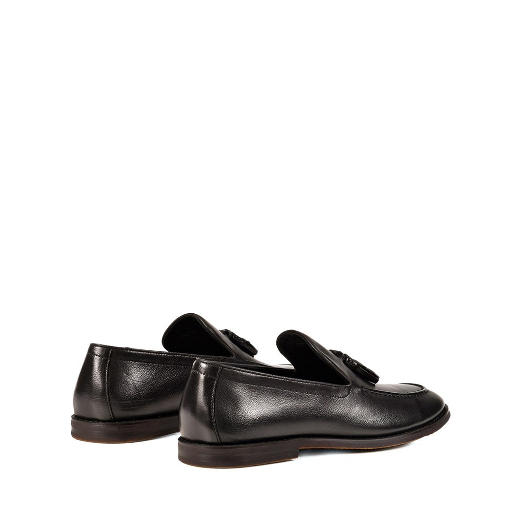 <p>Лоферы&nbsp;из гладкой чёрной кожи &mdash; сдержанная классика на каждый день и для офиса. Чистый силуэт с аккуратным скруглённым мысом дополнен объемным швом по ранту и традиционными кисточками на подъёме.&nbsp;Внутри &mdash; мягкая кожаная подкладка и гибкая подошва, которые обеспечивают комфортную посадку в течение всего дня. Лоферы легко сочетаются с классическими костюмами, чиносами и джинсами, оставаясь универсальной парой для деловых встреч и&nbsp;повседневных образов.</p>