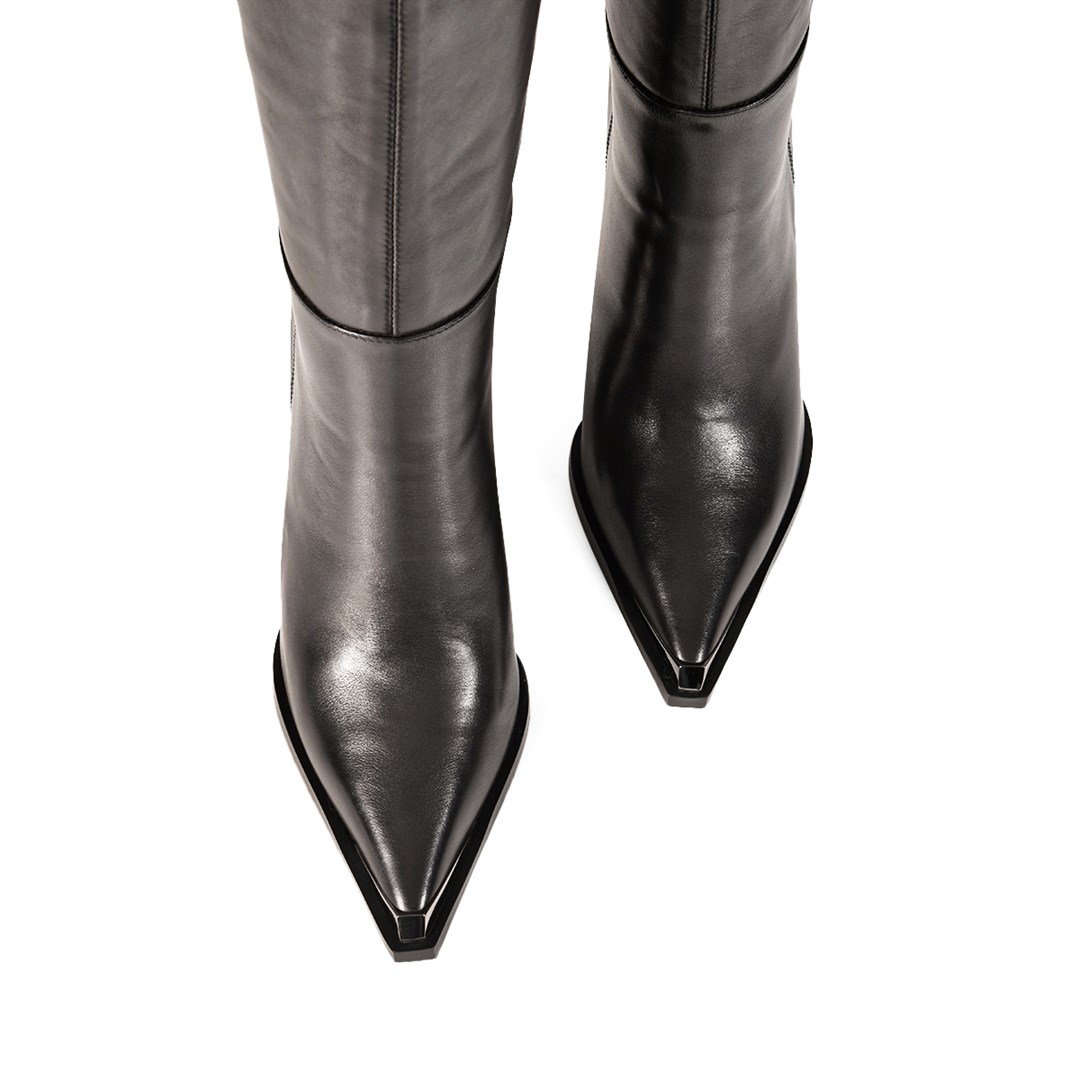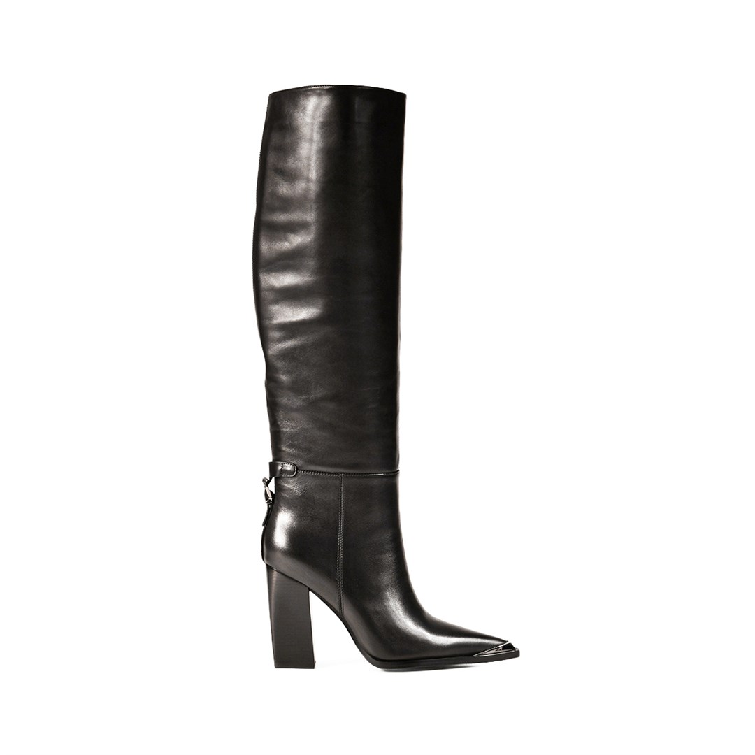 В новой модели сапог Chewhite Premium бунтарский дух культовых казаков обретает элегантные мотивы. Удлиненное голенище хорошо держит форму и рифмуется с высоким и в то же время устойчивым геометричным каблуком. Лаконичный дизайн дополнен единственным акцентом — деталью в области носочной части. Металлический элемент эффектно перекликается с блеском натуральной отполированной кожи черного цвета. Устойчивая модель станет комфортным дополнением жественных образов.