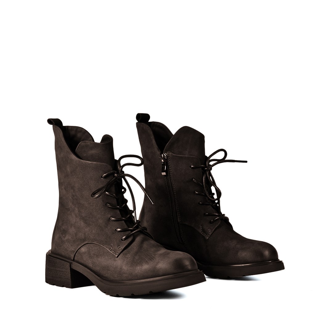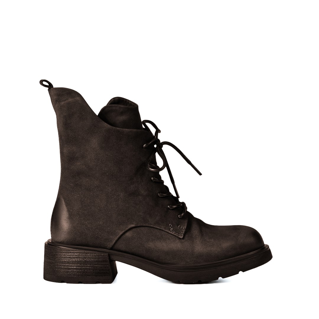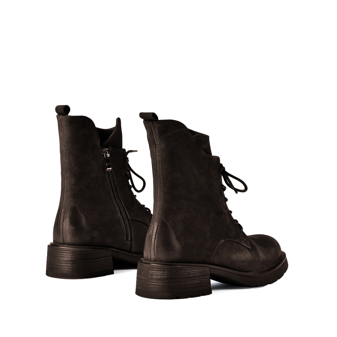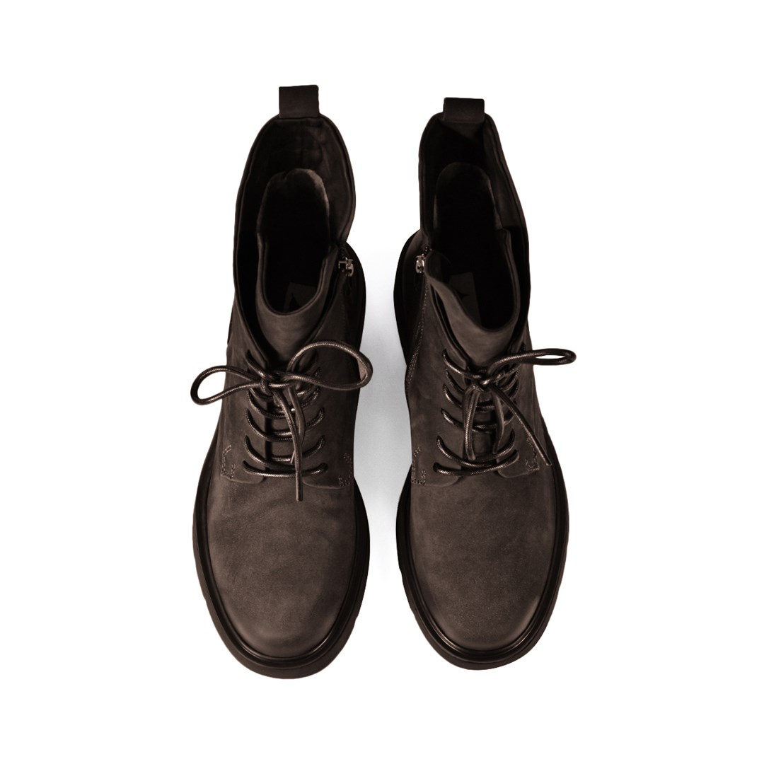 Высокие ботинки на шнуровке — универсальный выбор для холодного сезона. Модель выполнена из натуральной замши глубокого серого оттенка и дополнена устойчивым каблуком для максимального комфорта. Многослойная подошва с протектором защищает от скольжения, а подкладка и стелька из мягкого текстиля обеспечивают комфорт и надежную защиту от холода. Ботинки поддержат как классические сочетания, так и трендовые стилизации, например, с выглядывающими сверху носками и расслабленной шнуровкой.