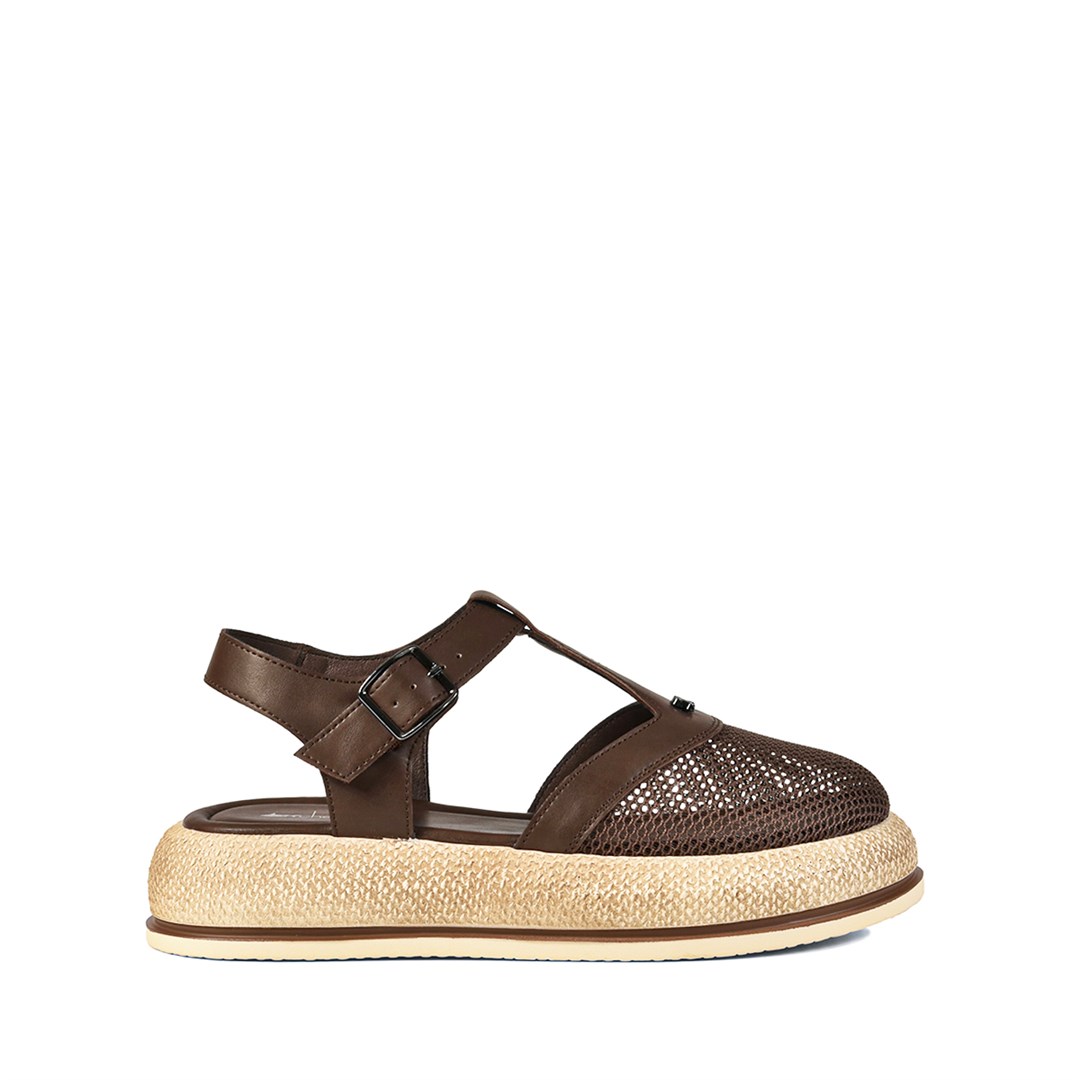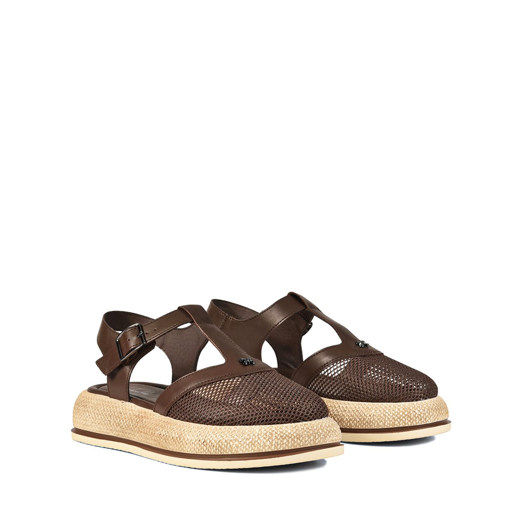<p>Сандалии в тёплом коричневом оттенке выдержаны в расслабленной летней эстетике: гладкие кожаные ремни сочетаются с перфорированным мысом и контрастной платформой в фактуре под рафию. Закрытая носочная часть&nbsp;делает модель практичной для городского ритма, а мягкий цвет легко сочетается с натуральными и базовыми оттенками гардероба. Стелька из натуральной кожи и лёгкая платформа смягчают нагрузку при ходьбе, а ремешок с пряжкой фиксирует ногу и позволяет отрегулировать посадку по полноте. Пара органично смотрится с льняными брюками, джинсами, шортами и простыми платьями, подойдёт для долгих прогулок и&nbsp;путешествий.</p>