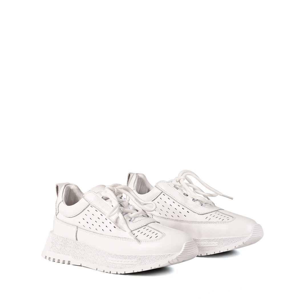 <p>Кроссовки на платформе созданы для активного городского ритма и современных кэжуал‑образов. Модель выполнена из мягкой белой кожи с перфорацией, которая обеспечивает дополнительную воздухопроницаемость и делает пару комфортной для теплого сезона. Удобная шнуровка позволяет отрегулировать посадку по подъему, а петля&nbsp;на пятке облегчает надевание. Высокая фактурная платформа визуально вытягивает силуэт и обеспечивает мягкую амортизацию при ходьбе, рельефный протектор отвечает за устойчивость на разных поверхностях. Чистый белый цвет легко сочетается с джоггерами, брюками и минималистичными платьями, становясь базой для повседневного гардероба.</p>