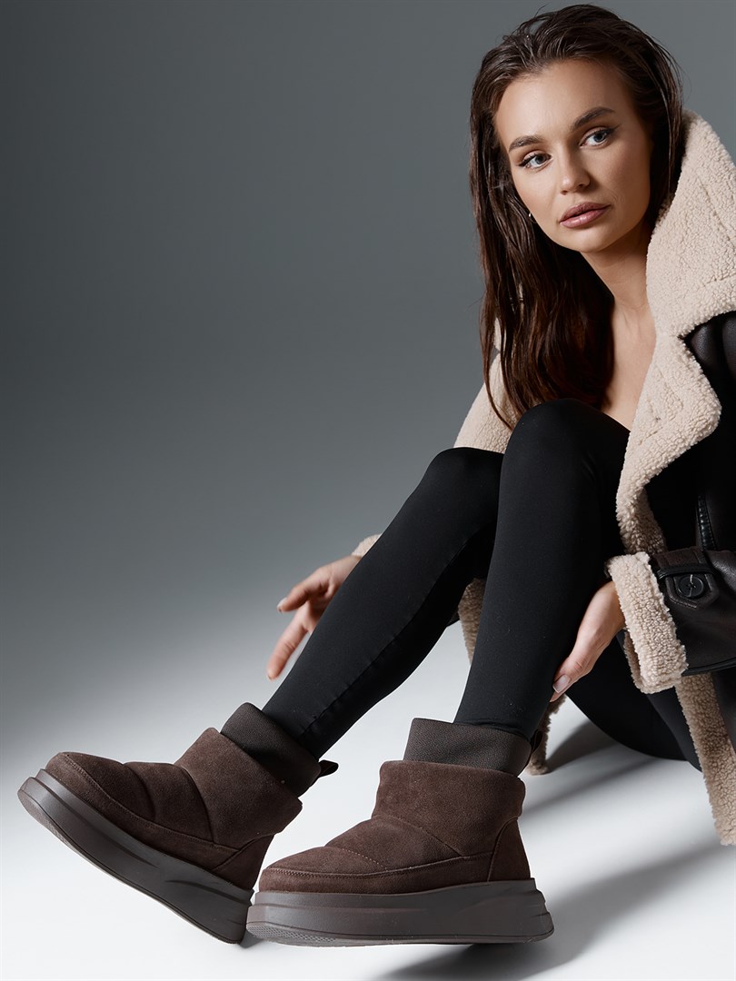 Угги из новой коллекции объединяют уют и актуальный стиль. Модель выполнена из натуральной замши и дополнена подкладкой из мягкой овечьей шерсти. Высокая подошва с рельефом предотвращает скольжение, а универсальный коричневый цвет и минималистичный дизайн позволяют легко сочетать пару с любыми повседневными образами. Модель рассчитана на температуру до -20⁰C.