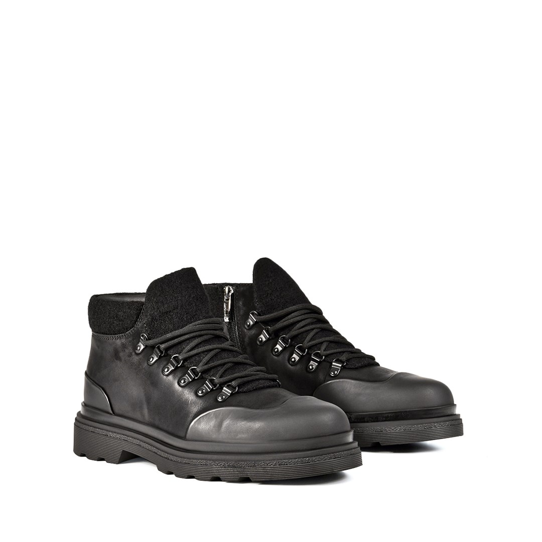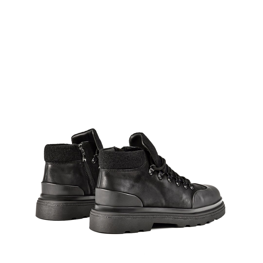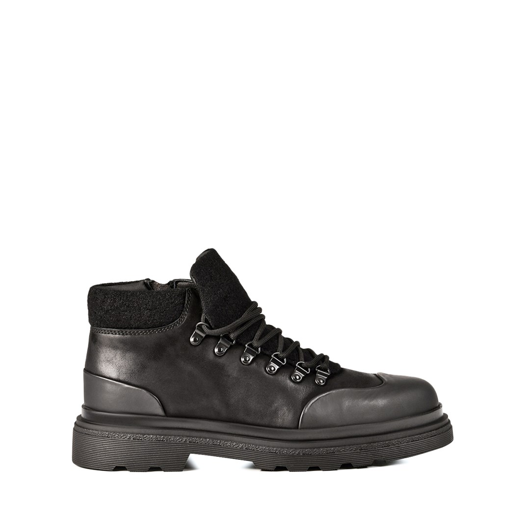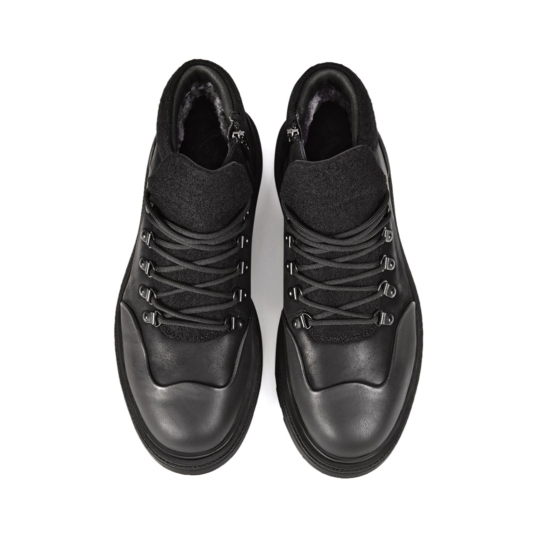 Мужские зимние хайкеры  — надёжный выбор для холодного сезона. Модель выполнена из натуральной кожи в базовом черном цвете и дополнена мягкой вставкой из шерсти на голенище. Внутри — подкладка из натурального меха, которая сохраняет тепло и обеспечивает комфорт. Прочная рельефная подошва предотвращает скольжение, а функциональная шнуровка гарантирует удобную посадку. Современный дизайн легко сочетается с джинсами и брюками, делая эту пару универсальным решением для зимнего гардероба.