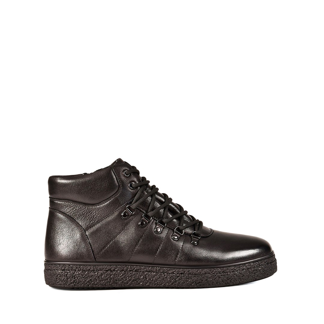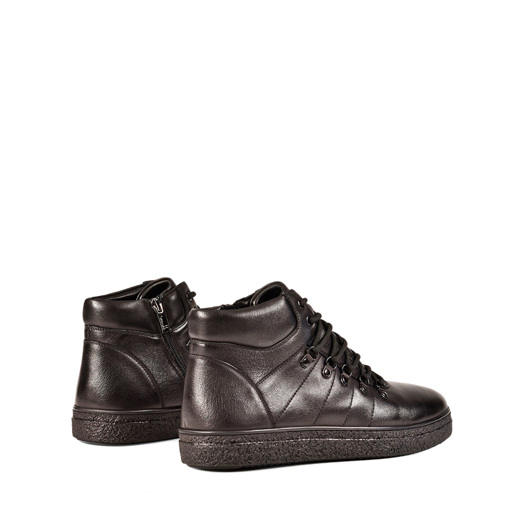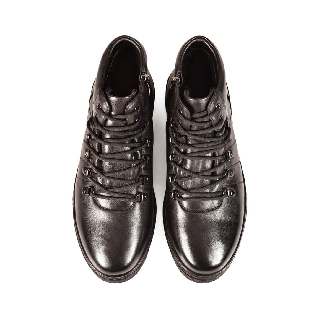 Зимние ботинки в спортивном стиле — универсальный выбор для холодного сезона. Модель выполнена из натуральной кожи в классическом чёрном цвете и дополнена мягкой подкладкой из натурального меха для максимального комфорта. Функциональная шнуровка и легкая подошва с рельефным рисунком будет устойчива к скольжению. Лаконичный дизайн легко сочетается с джинсами и брюками, делая эту пару практичным решением для городских образов.
