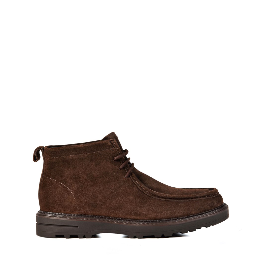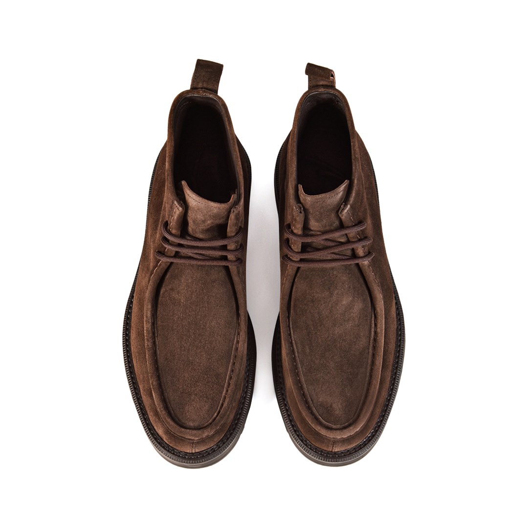 Демисезонные ботинки в лаконичном исполнении — универсальный выбор для городского гардероба. Модель выполнена из натуральной замши в насыщенном коричневом оттенке. Акцентный шов и округлая носочная часть придают паре современное звучание, а рельефная подошва обеспечивает уверенность на разных поверхностях. Лаконичный дизайн легко сочетается с джинсами и брюками в повседневных образах.