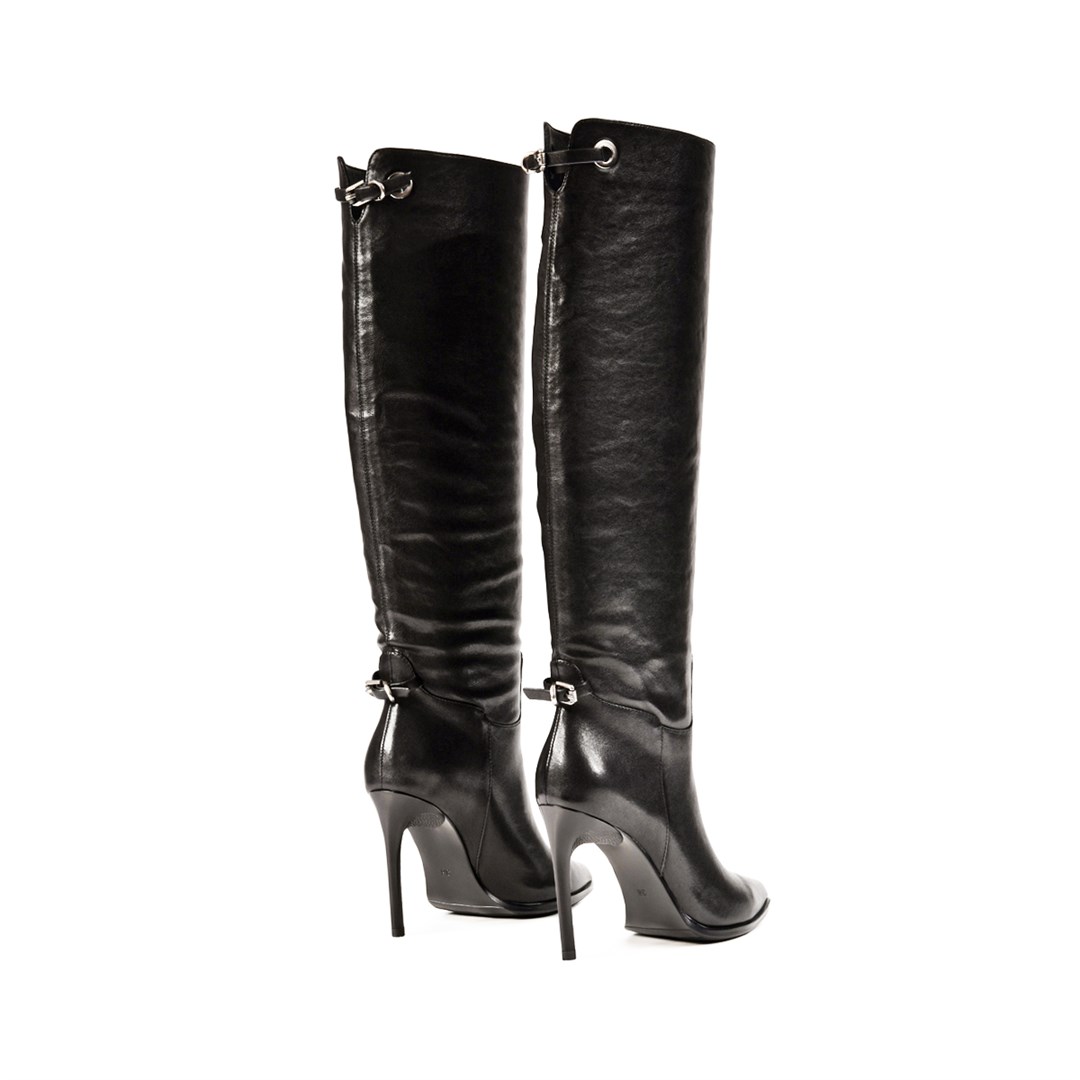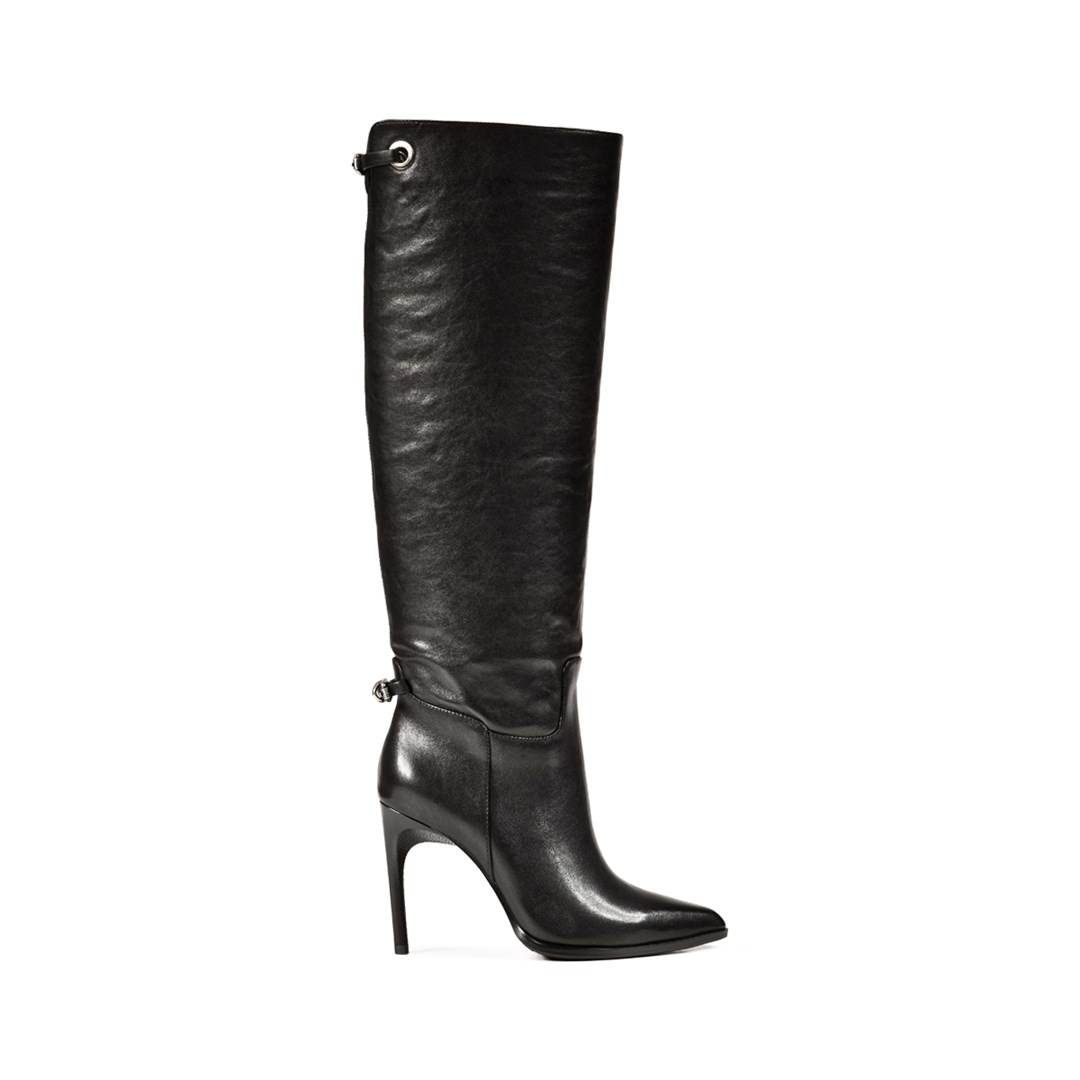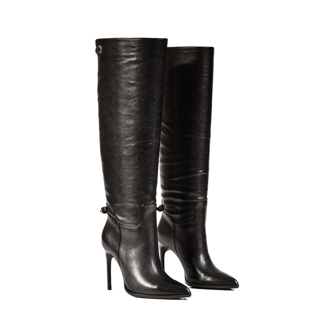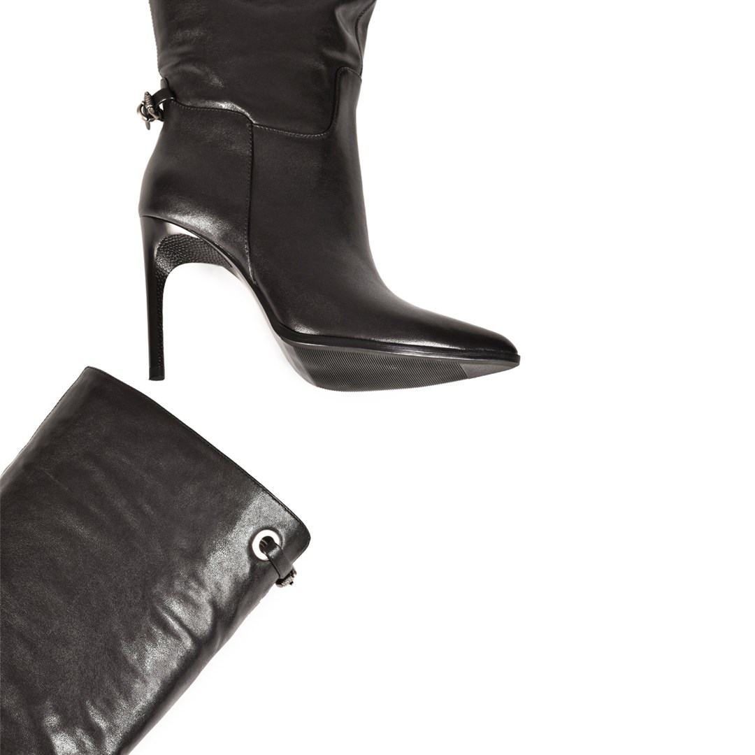 Высокие сапоги с утончённым силуэтом — элегантное решение для демисезонного гардероба. Модель выполнена из натуральной гладкой кожи в классическом чёрном цвете. Заострённый мыс, изящная шпилька и приталенное голенище подчёркивают женственность образа, а акцентные металлические детали добавляют современное звучание. Универсальный дизайн позволяет сочетать пару как с платьями, так и с узкими брюками, создавая выразительные образы на каждый день.
