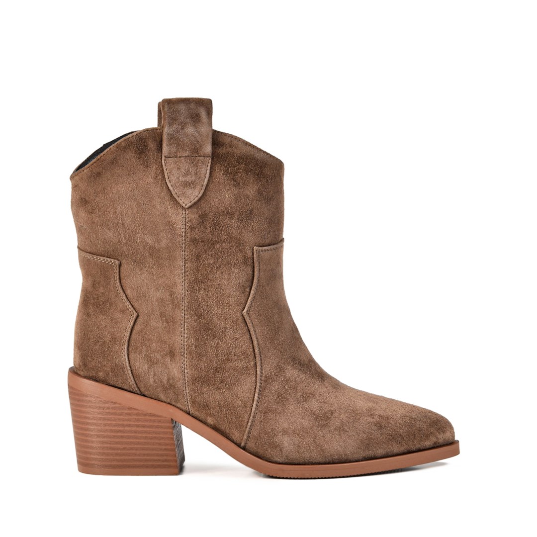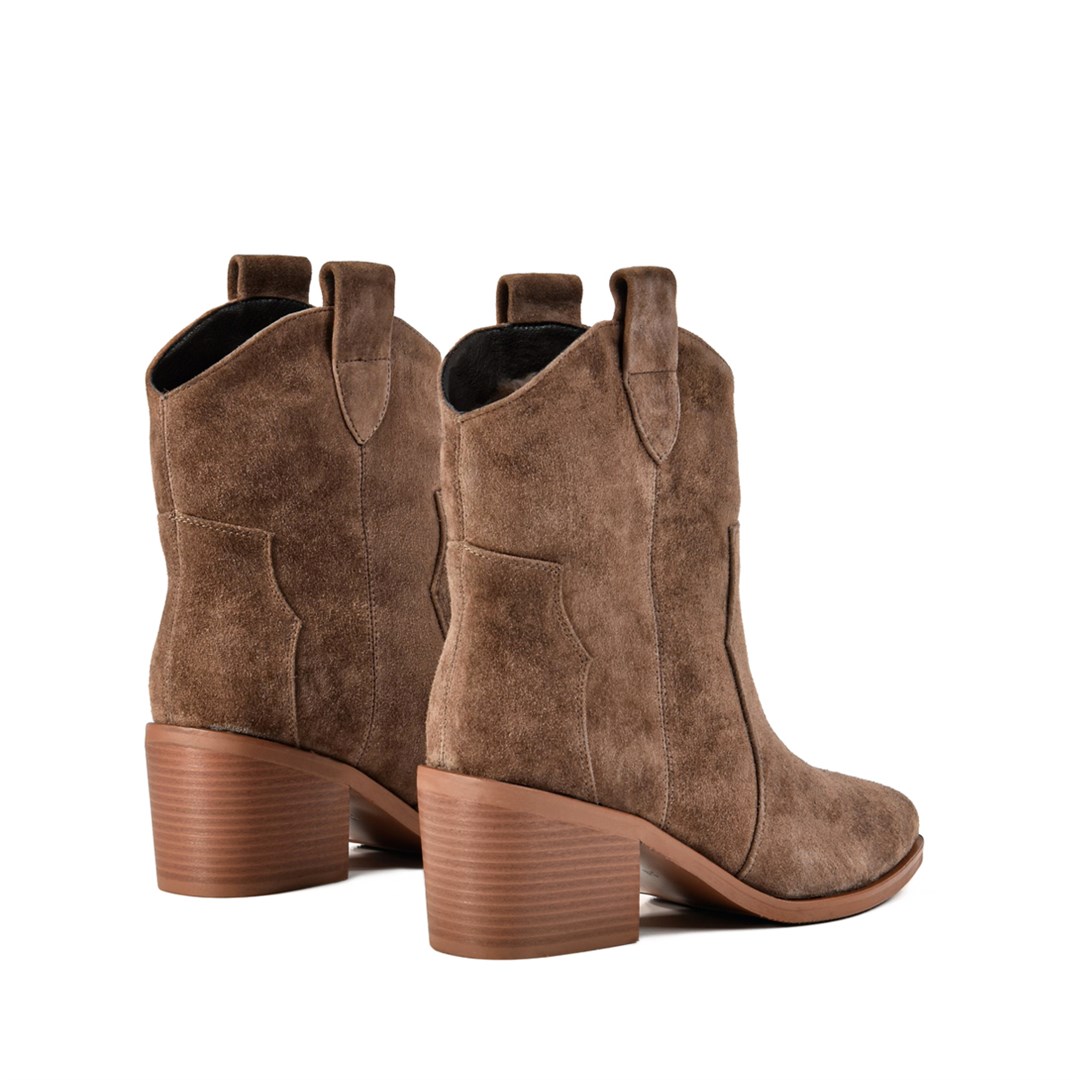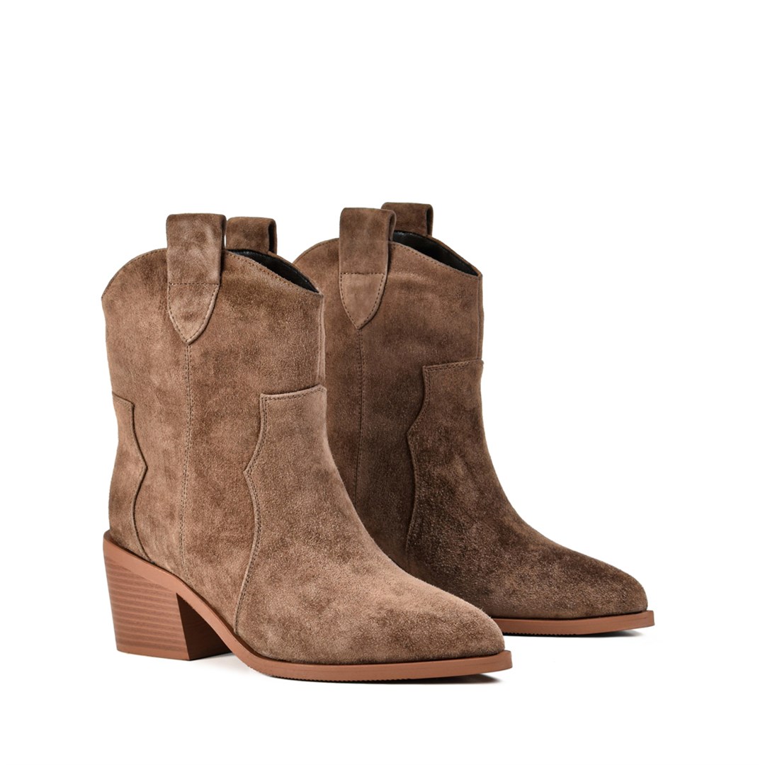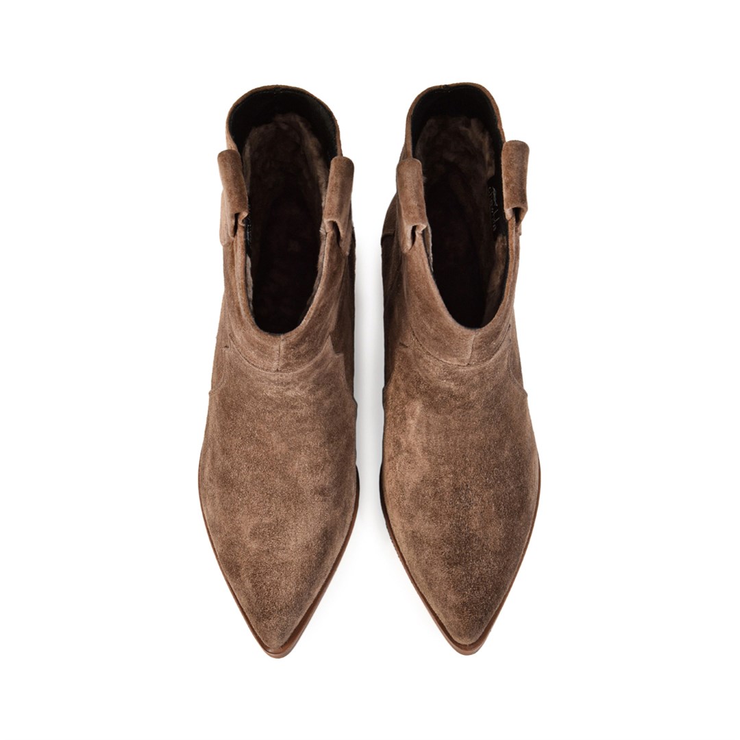 Ботильоны в стиле вестерн — актуальный акцент для зимнего гардероба. Модель выполнена из натуральной замши в тёплом серо-бежевом оттенке. Заострённый мыс и устойчивый каблук придают силуэту элегантность, а характерные детали верха подчёркивают современное звучание. Универсальный дизайн легко сочетается с джинсами, юбками и платьями, позволяя создавать стильные образы на каждый день.