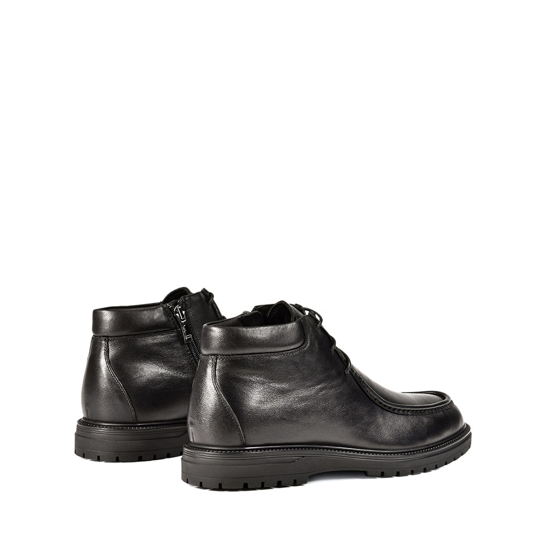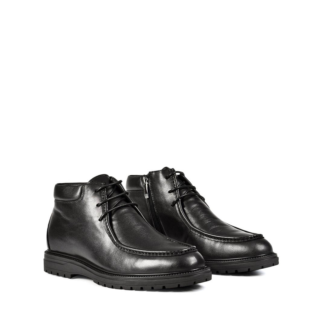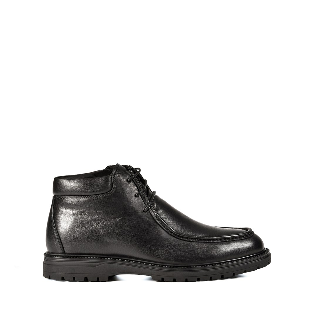 Зимние ботинки в лаконичном исполнении — универсальный выбор для холодного сезона. Модель выполнена из натуральной гладкой кожи черного цвета и дополнена подкладкой из натурального меха для максимального комфорта. Рельефная подошва предотвращает скольжение, а аккуратная шнуровка и акцентный шов придают паре современный характер. Универсальный дизайн легко сочетается с джинсами и брюками в разных стилях.