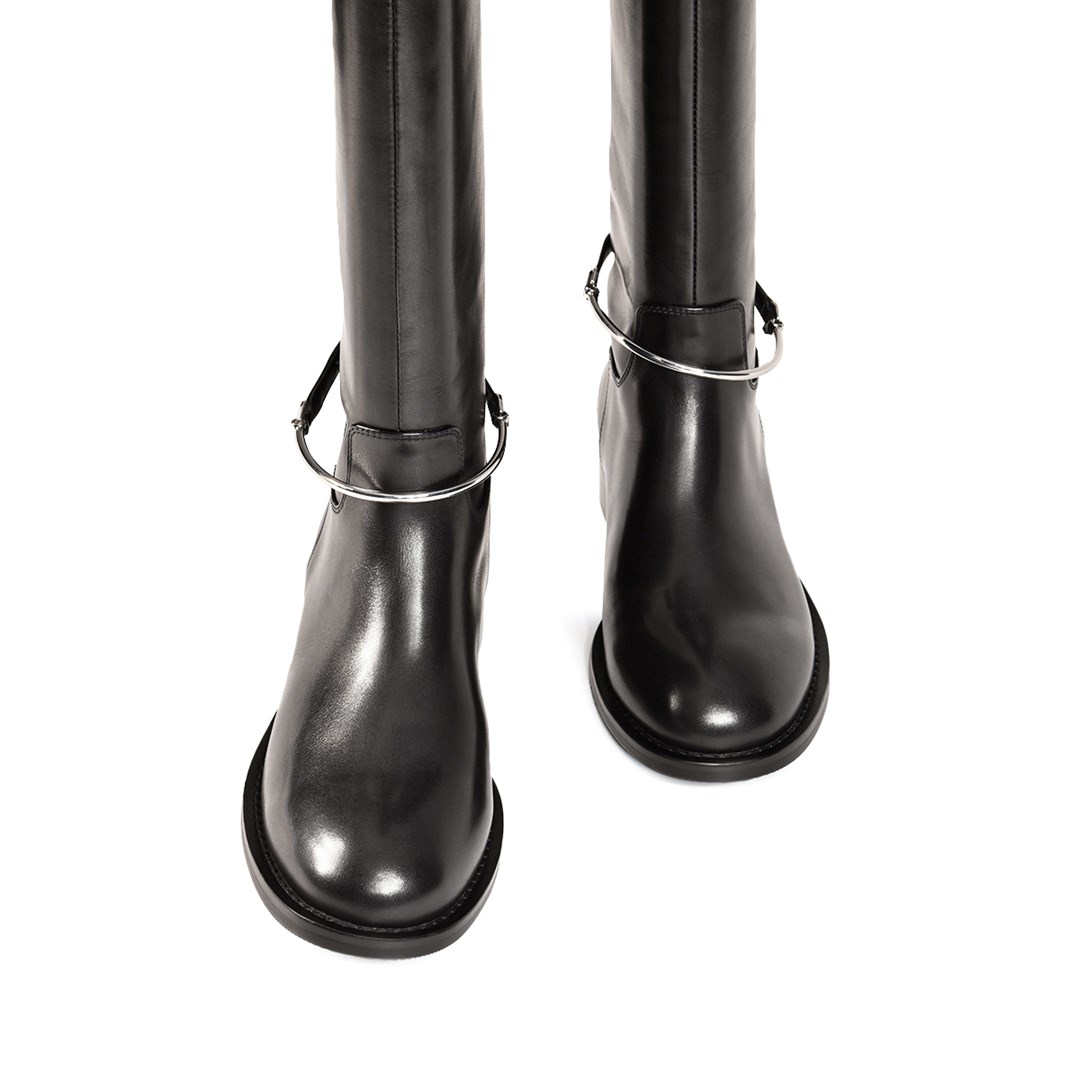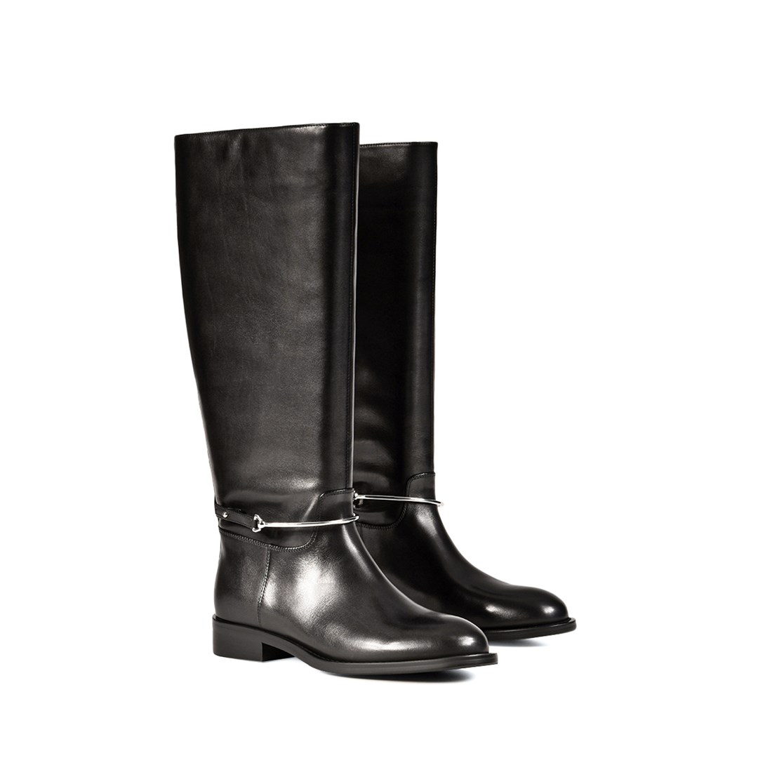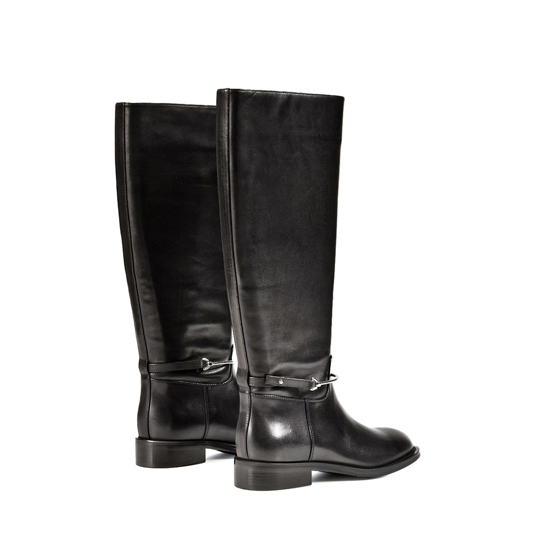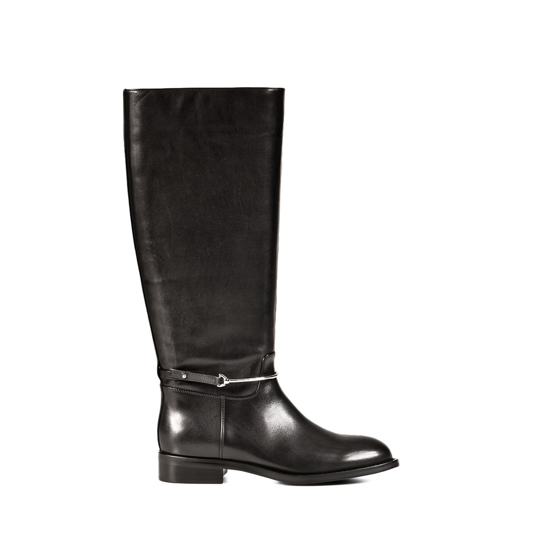 Классические сапоги в стиле riding boots — универсальное решение для демисезонного гардероба. Модель выполнена из натуральной гладкой кожи в насыщенном чёрном цвете и дополнена изящным ремешком с металлической фурнитурой, который акцентирует щиколотку. Прямое голенище и аккуратный мыс подчёркивают элегантность силуэта. Лаконичный дизайн позволяет сочетать пару с юбками, платьями и брюками, создавая утончённые образы на каждый день.
