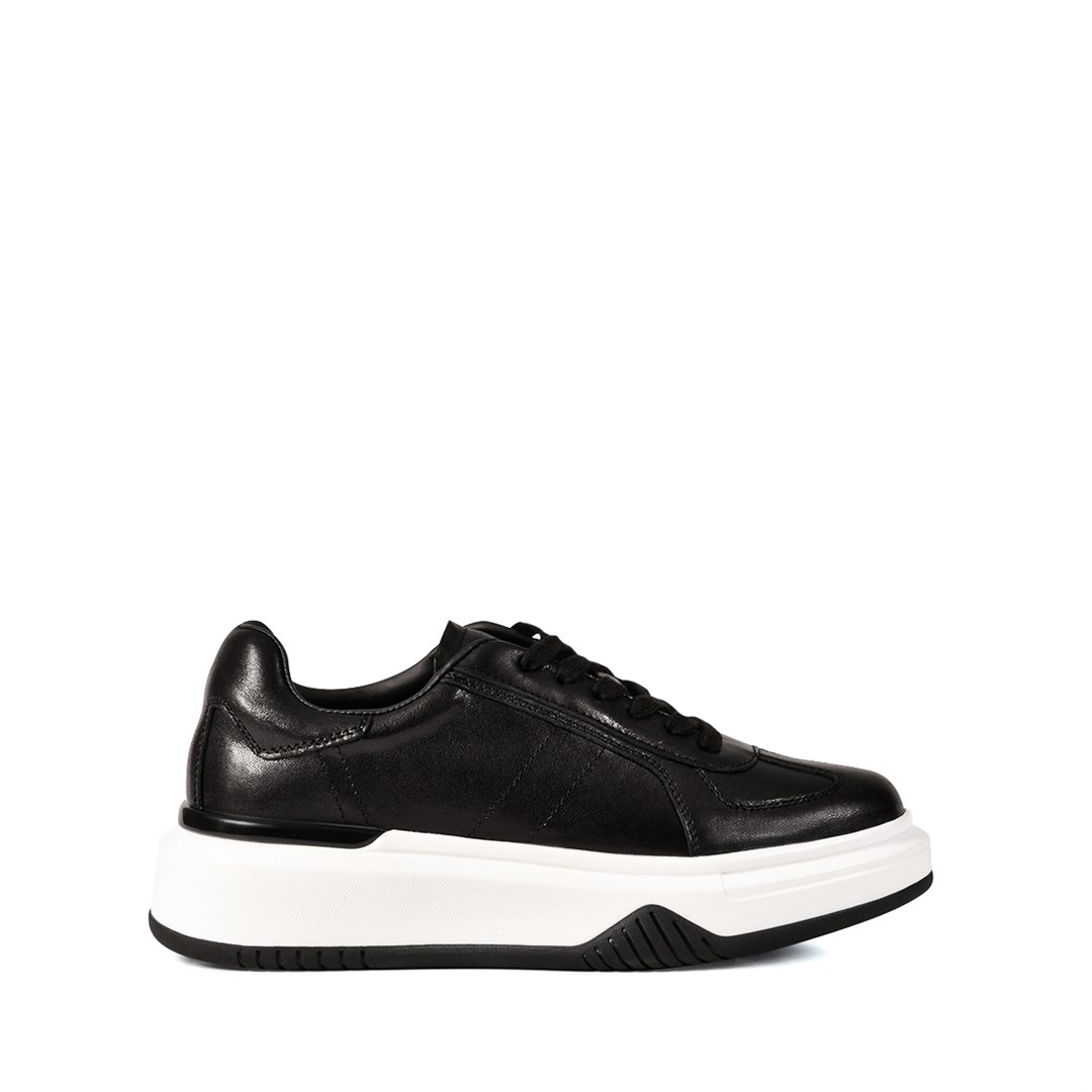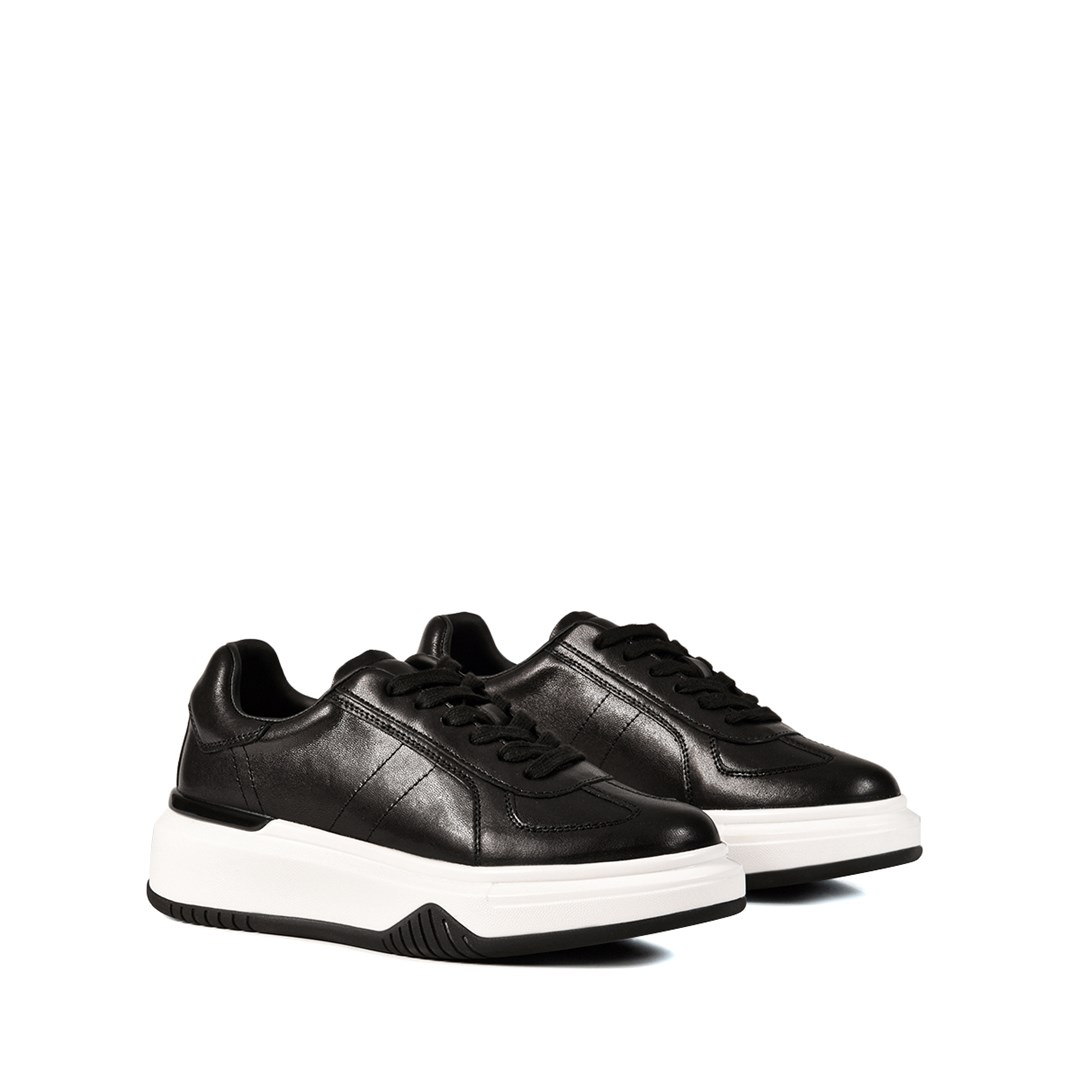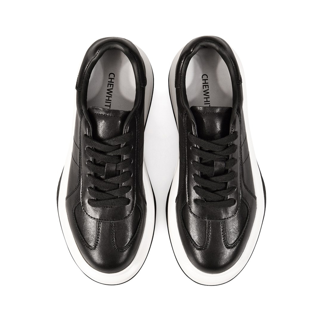 <p>Кроссовки на высокой подошве&nbsp;созданы для динамичного городского ритма и современных casual‑образов. Модель выполнена из мягкой черной кожи с деликатным блеском и лаконичной строчкой, поддерживающей чистый силуэт. Классическая шнуровка позволяет точно отрегулировать посадку по подъему, а мягкий ворот бережно фиксирует стопу. Объемная двухцветная подошва визуально вытягивает силуэт и обеспечивает мягкую амортизацию при ходьбе, рельефный низ отвечает за уверенное сцепление с поверхностью. Контраст черного верха и белой платформы легко сочетается с джинсами, брюками и минималистичными платьями, делая пару универсальной для повседневного гардероба.</p>
