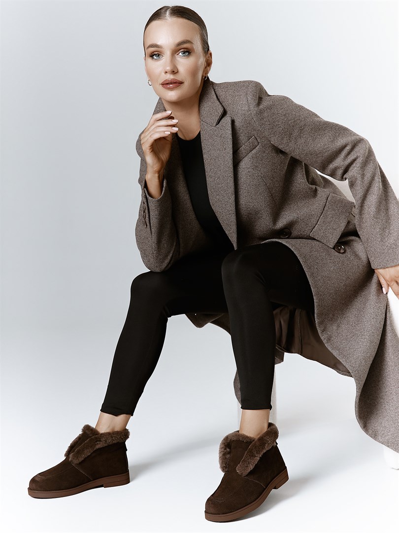 Уют и сдержанный стиль в одной паре: ботинки Chewhite, выполненные из натуральной замши темно-коричневого цвета, станут трендовым и практичным выбором для зимнего периода. Нейтральный оттенок и чистый минималистичный дизайн делают модель универсальной — она легко впишется в разные повседневные образы. Конструкция поддерживает расслабленный дизайн: округлая носочная часть с акцентной строчкой и натуральный мех, который плавно переходит в наружную часть модели и становится частью ее дизайна.