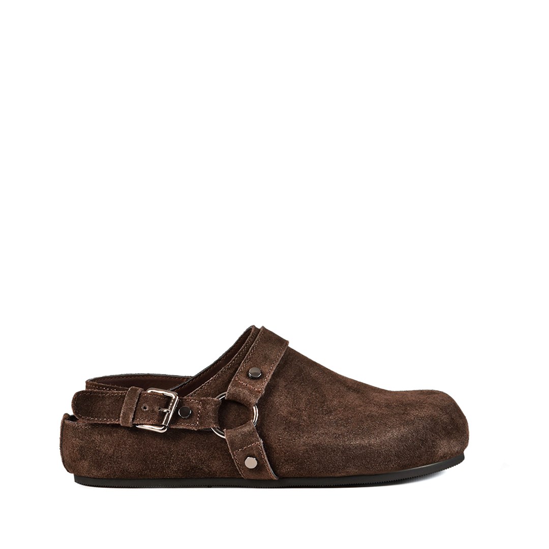 <p>Минималистичные мюли&nbsp;в насыщенном шоколадном оттенке &mdash; трендовая пара для тех, кто ценит комфорт и расслабленный городской стиль. Закрытая носочная часть создаёт аккуратный, немного &laquo;игрушечный&raquo; силуэт, а фигурные ремешки с металлическим кольцом&nbsp;добавляют лёгкий утилитарный характер. Регулируемый задний ремень позволяет настроить посадку по ноге или опустить его и носить модель как мюли. Замша мягко облегает стопу, тонкая гибкая подошва обеспечивает естественный ход и комфорт в течение дня. Глубокий шоколадный оттенок легко вписывается в базовую палитру гардероба и гармонирует с денимом, льном и объёмным трикотажем.</p>