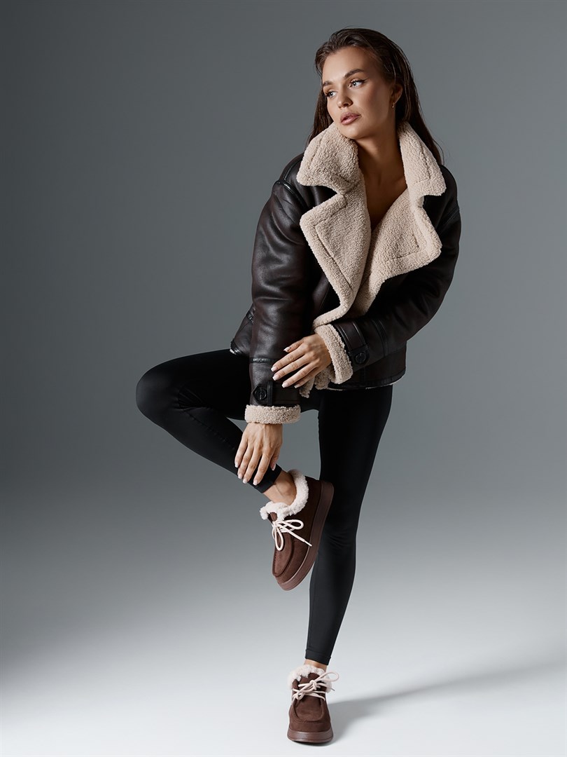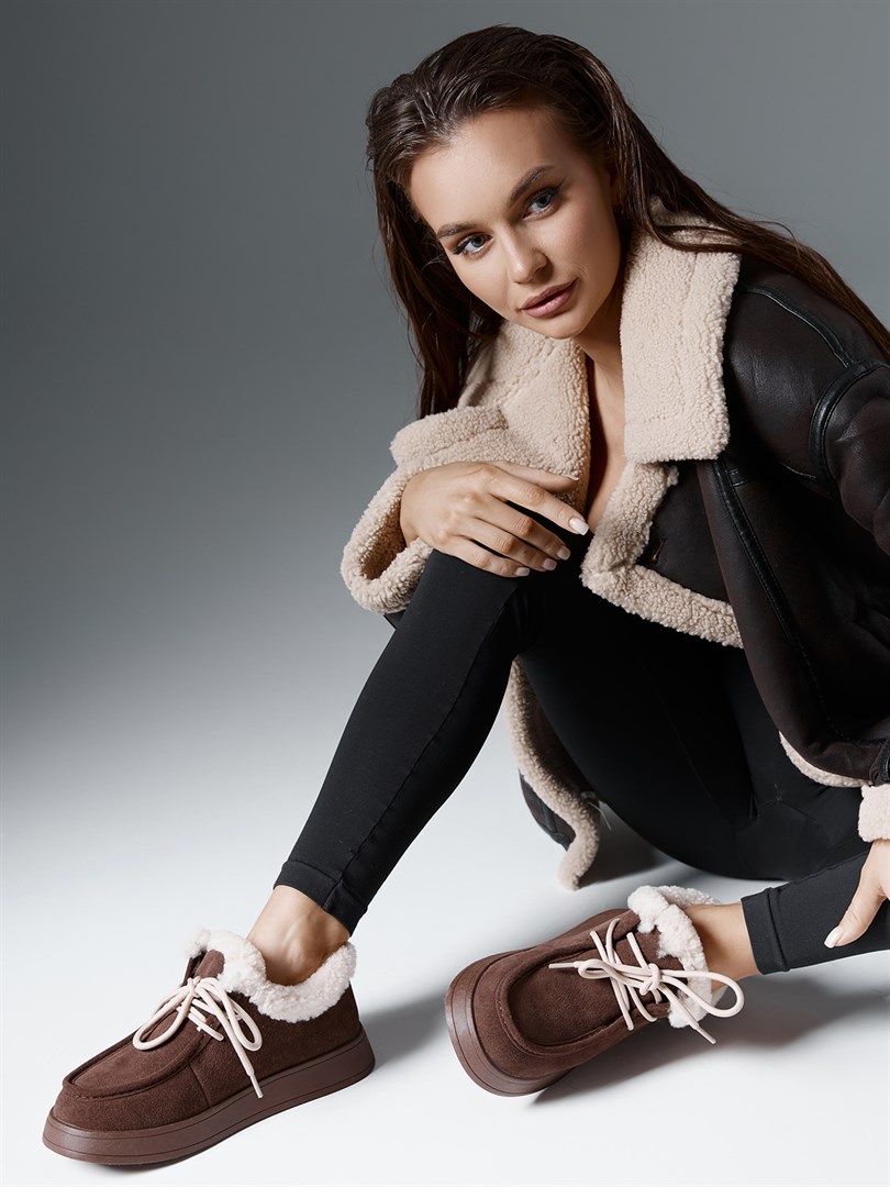 Сочетание уюта и современного стиля: зимние полуботинки с подкладкой из натуральной овечьей шерсти, выполненные из мягкой замши глубокого коричневого оттенка, станут идеальным выбором для холодного времени года. Универсальный цвет и лаконичный силуэт позволяют легко вписать эту пару в повседневный гардероб, создавая гармоничные образы в разных стилях. Модель отличается расслабленной формой и выразительным швом на округлой носочной части. Ботинки надежно фиксируются на ноге с помощью шнурков.