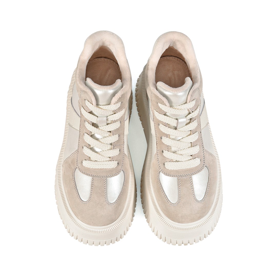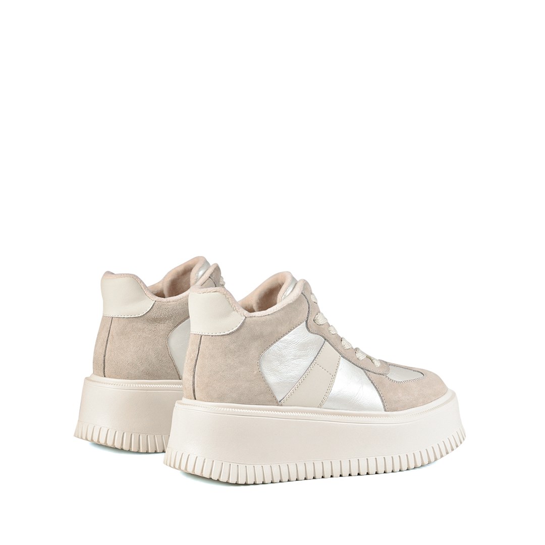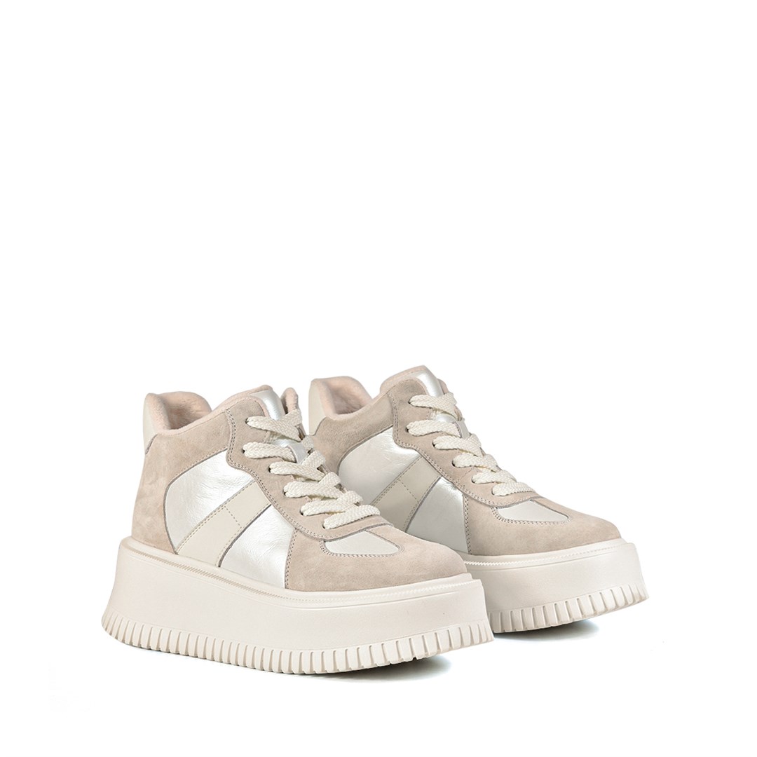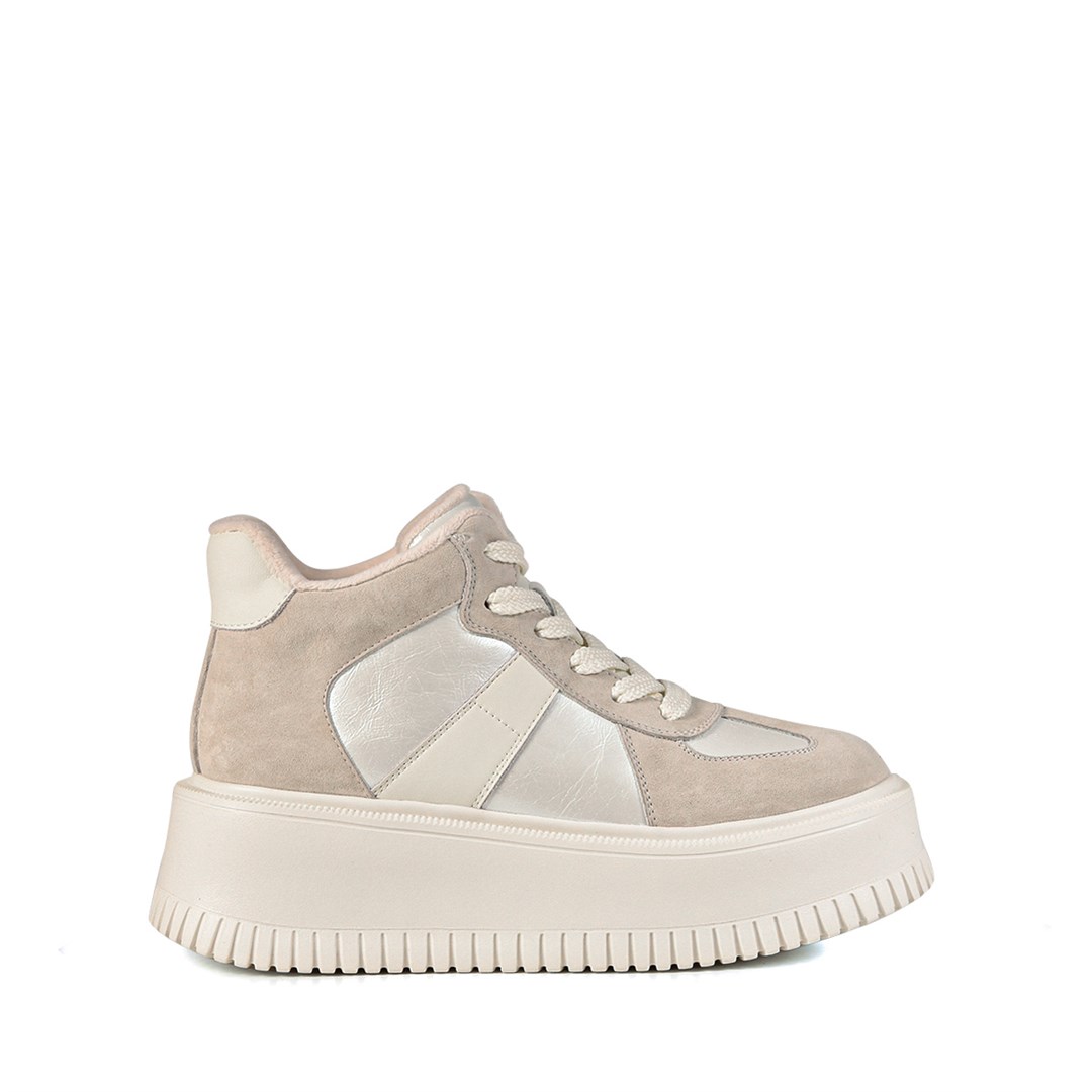 Демисезонные кеды выполнены из натуральной замши в светло-бежевом оттенке с акцентными металлизированными вставками. Массивная платформа с рельефным протектором придаёт модели актуальный вид и обеспечивает комфорт при ходьбе. Лаконичный силуэт и светлая цветовая палитра делают эту пару стильным акцентом для городских и кэжуал-образов. Внутренняя отделка из мягкого текстиля гарантирует удобство на протяжении всего дня.