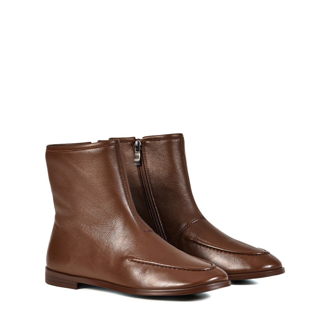 <p>Минималистичные ботинки‑чулки из гладкой кожи &mdash; спокойная альтернатива классическим челси и берцам. Чистый верх без шнуровки, аккуратный шов по линии носочной части и мягкий контур голенища формируют собранный, графичный силуэт. Низкий ход и мягкая кожа позволяют носить пару весь день без ощущения усталости. Ботинки легко вписываются в городской гардероб: сочетайте их с прямыми джинсами, широкими брюками, трикотажными платьями и юбками миди. Тёплый коричневый оттенок хорошо работает с базовой палитрой &mdash; бежевыми, молочными и чёрными вещами, добавляя образу мягкости и уверенности одновременно.</p>