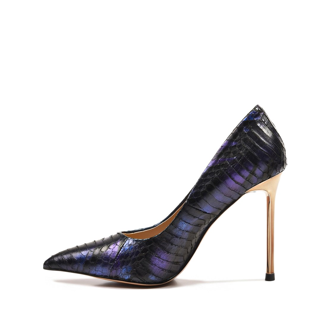 Туфли-лодочки Chewhite Limited с эффектом безудержного сияния созданы для тех, кто не боится восхищенных взглядов. Модель выполнили из натуральной кожи с трендовым тиснением под рептилию в фиолетовом цвете. Дизайнеры при изготовлении пары уделили особое внимание удобству ног — выверенная колодка и мягкая кожаная стелька обеспечивают максимальный комфорт при движении.