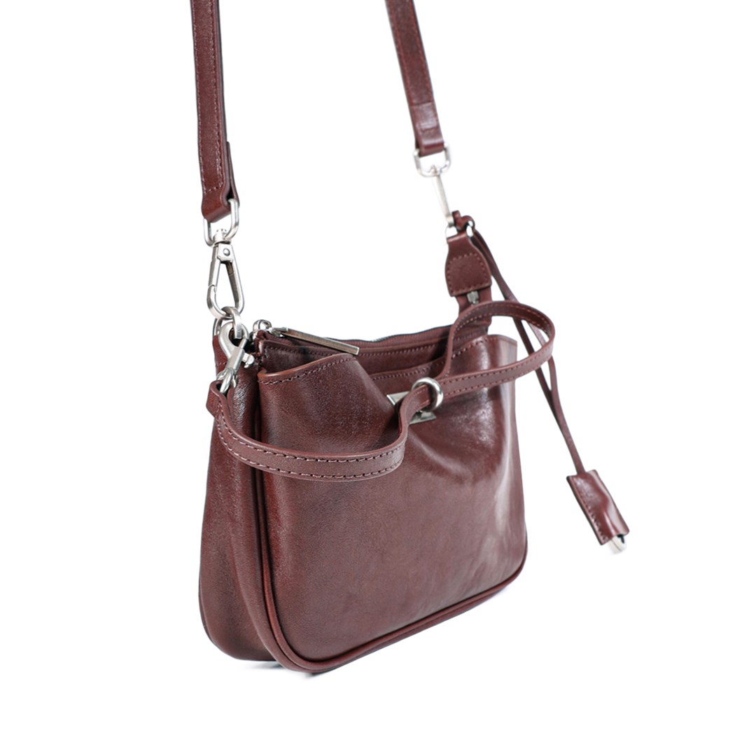 <p>Кросс-боди из мягкой кожи в насыщенном винно‑коричневом оттенке &mdash; лаконичный акцент для повседневных образов. Чистый прямоугольный силуэт дополнен тонким поясом на металлической петле, который подчёркивает линию верха и поддерживает фирменный минимализм. Регулируемый ремень позволяет подстроить посадку сумки, а продуманное внутреннее отделение на молнии удобно вмещает телефон, мини‑кошелёк и необходимые мелочи. Модель подойдёт тем, кто предпочитает лёгкие, но выразительные аксессуары в спокойной природной гамме.</p>