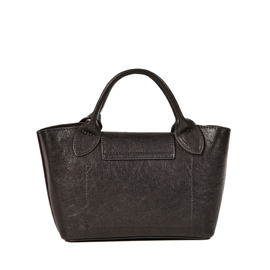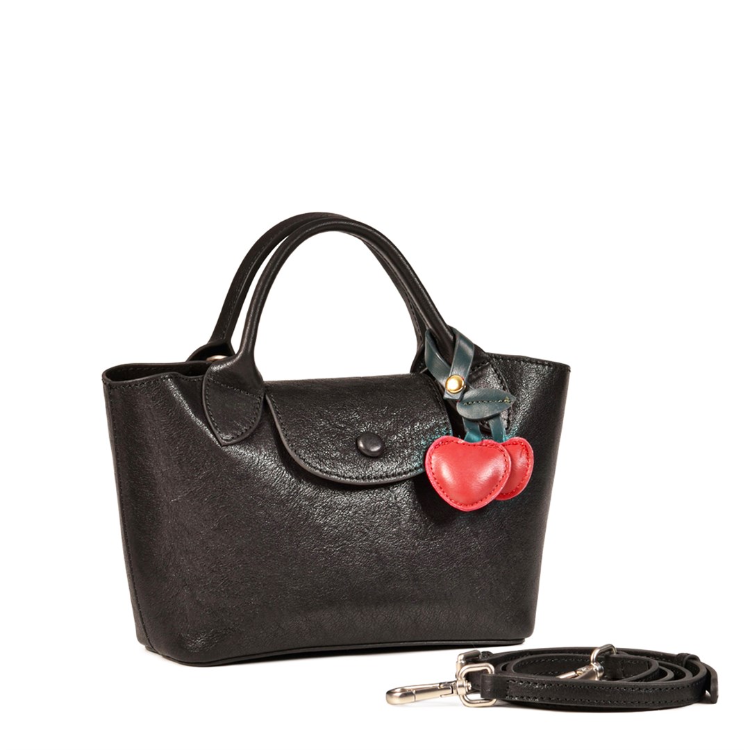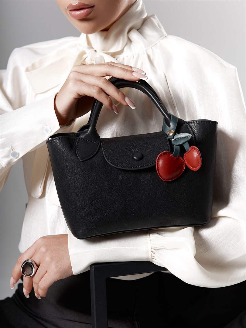 <p>Сумка‑тоут из гладкой чёрной кожи с игривым акцентом в виде съёмного брелока‑вишен&nbsp;&mdash; лаконичная модель с характером. Округлый верх и мягкие боковые линии поддерживают женственный силуэт, а аккуратный клапан на кнопке подчёркивает графичность формы. Внутри &mdash; съёмный&nbsp;текстильный органайзер на кулиске и молнии: он помогает держать порядок, а при необходимости его можно использовать отдельно. В комплект также входит длинный ремень на карабинах, благодаря которому сумка трансформируется из &laquo;городской мини‑тоут&raquo; в кросс‑боди.</p>