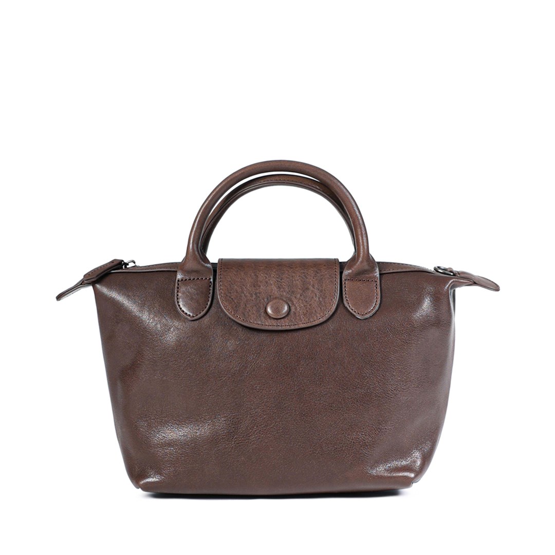 <p>Сумка‑тоут из мягкой кожи в насыщенном шоколадном оттенке &mdash; спокойный акцент для базового гардероба. Плавный трапециевидный силуэт дополнен округлыми короткими ручками и фирменным клапаном на кнопке, который мягко перекликается с классическими французскими моделями и придаёт образу утончённость. Гладкая кожа с деликатным блеском красиво раскрывает глубину цвета и со временем становится ещё благороднее. Основное отделение закрывается на молнию, внутри предусмотрены карманы для телефона и мелочей. В комплект входит съёмный длинный ремень на карабинах, поэтому сумка легко подстраивается под дневной ритм города &mdash; от прогулок до встреч после работы.</p>